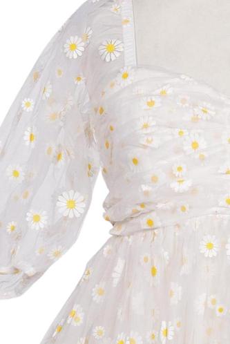 | Details | Stickerei, Tüll, Kurzarm, V-Ausschnitt, Reißverschluss/Knöpfe hinten, Floral |