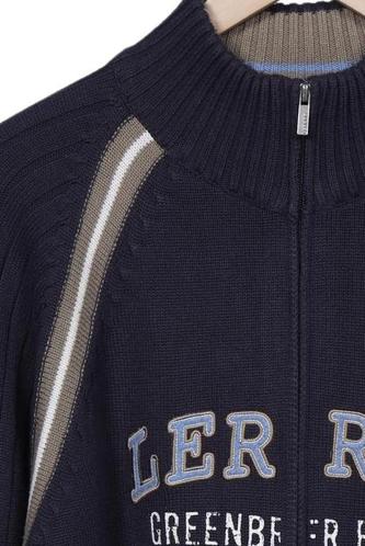 | Details | Grobstrick, Rundhals, Front Reißverschluss, Markenlogo, Streifen |