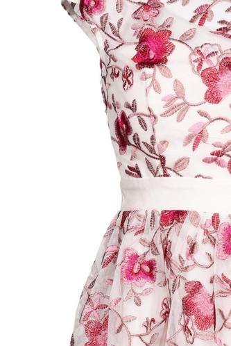 | Details | Tüll, Kurzarm, Rundhals, Reißverschluss/Knöpfe hinten, Floral |