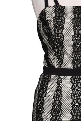 | Details | Spitze, ärmellos, V-Ausschnitt, Reißverschluss/Knöpfe hinten, Streifen |