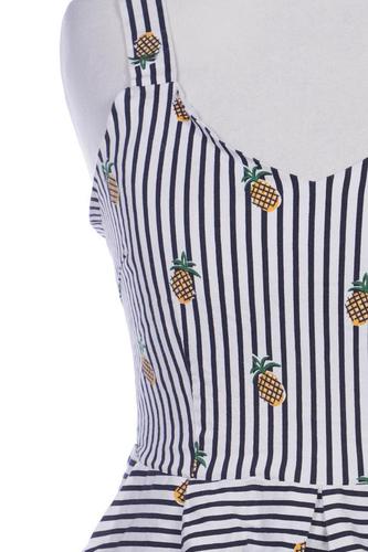| Details | ärmellos, V-Ausschnitt, Reißverschluss/Knöpfe hinten, Floral, Streifen |