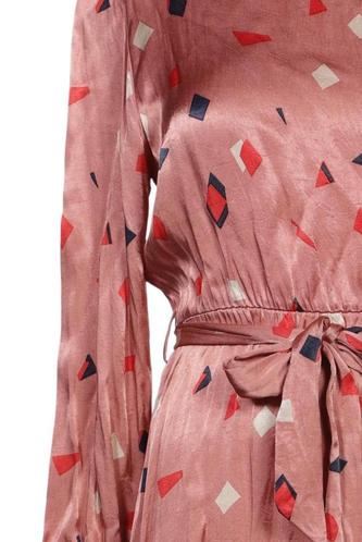 | Details | Satin, Rüschen, Langarm, Bindegürtel, Rundhals, Motivprint |