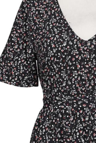 | Details | Rüschen, Kurzarm, V-Ausschnitt, Reißverschluss/Knöpfe hinten, Floral |