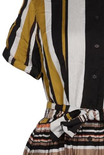 | Details | Plissee, Kurzarm, Bindegürtel, Rundhals, Front Knopfleiste, Streifen |