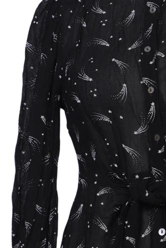 | Details | Chiffon, Langarm, Bindegürtel, Rundhals, Front Knopfleiste, Motivprint |