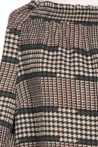 | Details | Satin, Langarm, V-Ausschnitt, verschlusslos, Kariert |