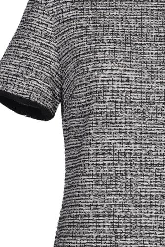 | Details | Grobstrick, Kurzarm, Rundhals, Reißverschluss/Knöpfe hinten, Hahnentritt |