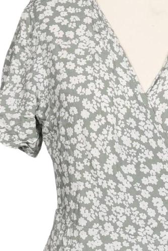| Details | Rüschen, Kurzarm, Wickeloptik, V-Ausschnitt, Floral |