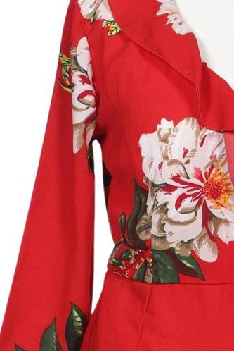 | Details | Rüschen, Langarm, Bindegürtel, Wickeloptik, V-Ausschnitt, Floral |