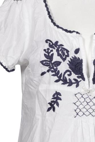 | Details | Jersey, Stickerei, Kurzarm, V-Ausschnitt, verschlusslos, Floral |