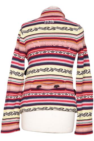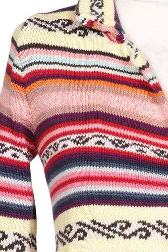| Details | Grobstrick, Langarm, V-Ausschnitt, Front Knopfleiste, Ethno, Streifen |
