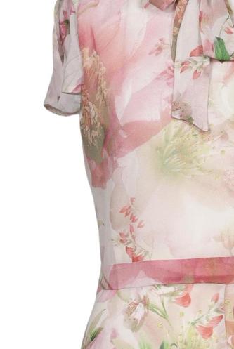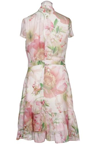 | Details | Rüschen, Chiffon, Kurzarm, Bindegürtel, V-Ausschnitt, Reißverschluss/Knöpfe hinten, Floral |