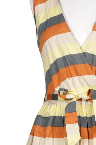 | Details | ärmellos, Bindegürtel, V-Ausschnitt, Reißverschluss/Knöpfe hinten, Streifen |