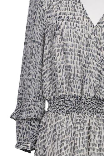 | Details | Rüschen, Chiffon, Dreiviertelarm, V-Ausschnitt, Gummizug/Tunnelzug, Motivprint |