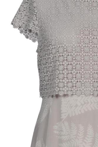 | Details | Spitze, Kurzarm, Rundhals, Reißverschluss/Knöpfe hinten, Floral |