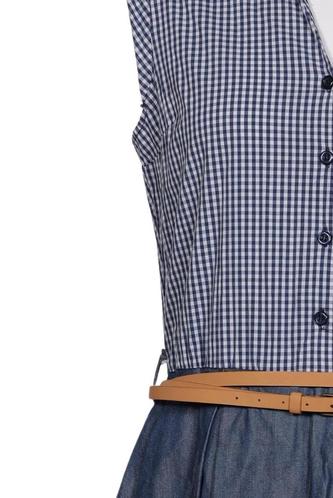 | Details | Jeans, Rüschen, ärmellos, Bindegürtel, V-Ausschnitt, Front Knopfleiste, Kariert |