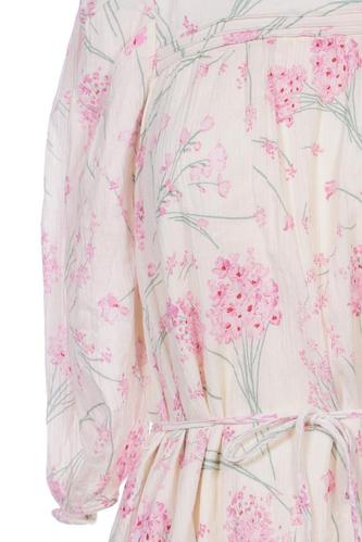 | Details | Rüschen, Dreiviertelarm, Bindegürtel, Rundhals, Gummizug/Tunnelzug, Floral |