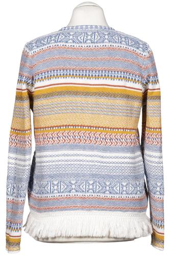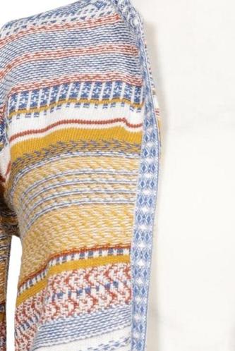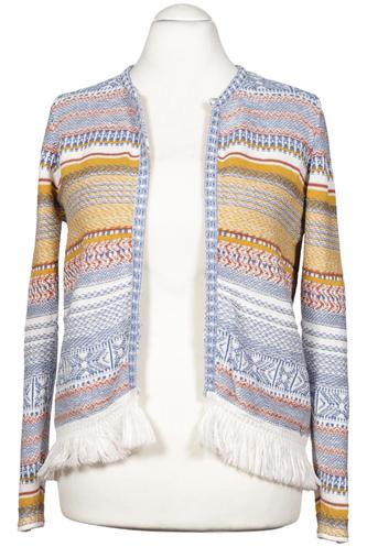 | Details | Fransen, Grobstrick, Langarm, Rundhals, Front Knopfleiste, Ethno, Streifen |
