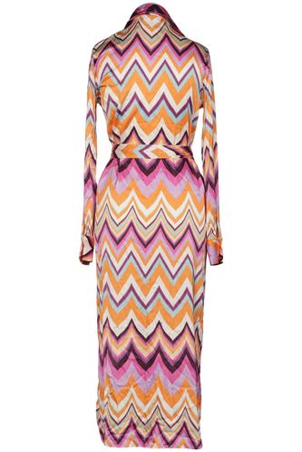 | Details | Satin, Langarm, Bindegürtel, Rundhals, Front Knopfleiste, Motivprint |