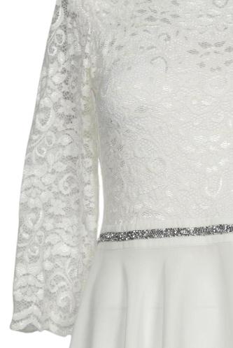 | Details | Strass, Spitze, Chiffon, Dreiviertelarm, Bindegürtel, Rundhals, Reißverschluss/Knöpfe hinten, Floral |