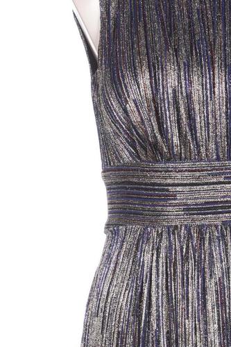 | Details | Satin, Plissee, metallic, ärmellos, Bindegürtel, Rundhals, Reißverschluss/Knöpfe hinten, Streifen |