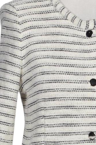 | Details | Grobstrick, Langarm, Rundhals, Front Knopfleiste, Streifen |