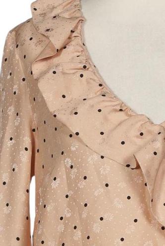 | Details | Jersey, Rüschen, Langarm, V-Ausschnitt, verschlusslos, Punkte |
