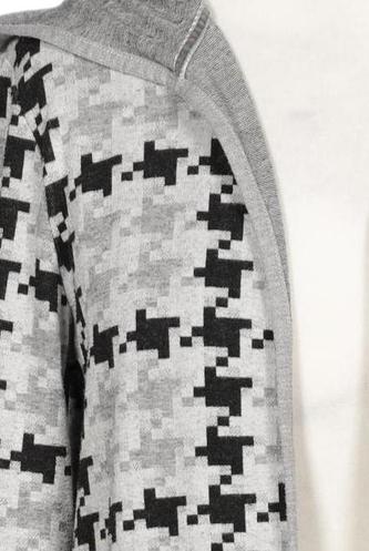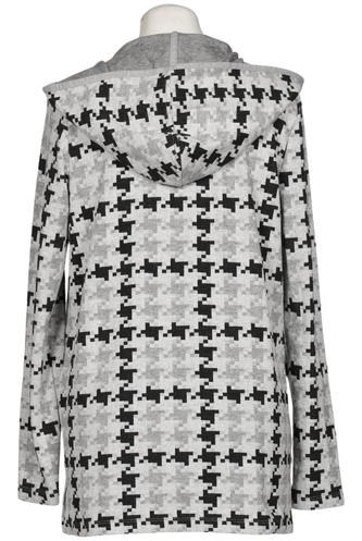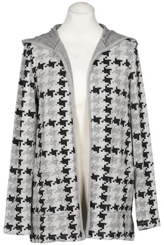 | Details | Grobstrick, Langarm, verschlusslos, Kapuze, Hahnentritt |