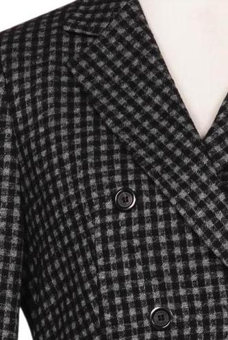 | Details | Langarm, V-Ausschnitt, Front Knopfleiste, Hahnentritt |