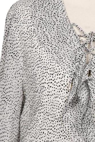 | Details | Schnürung, Rüschen, Chiffon, Langarm, V-Ausschnitt, verschlusslos, Gummizug/Tunnelzug, Punkte |