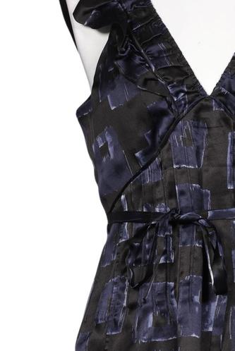 | Details | Satin, Rüschen, ärmellos, V-Ausschnitt, Reißverschluss/Knöpfe hinten, Motivprint |