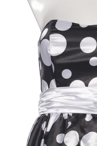 | Details | Satin, Rüschen, ärmellos, Bindegürtel, V-Ausschnitt, Reißverschluss/Knöpfe hinten, Punkte |