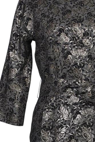 | Details | metallic, Dreiviertelarm, Bindegürtel, Rundhals, Reißverschluss/Knöpfe hinten, Floral |