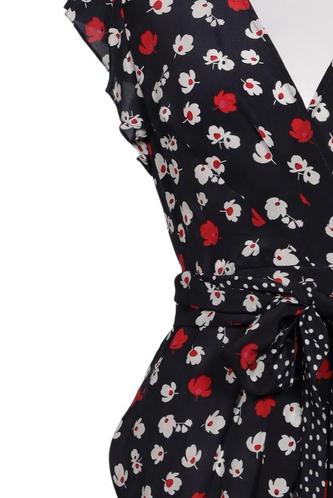 | Details | Jersey, Rüschen, Kurzarm, Bindegürtel, V-Ausschnitt, Floral |