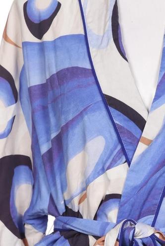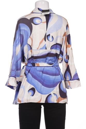 | Details | Satin, Dreiviertelarm, Bindegürtel, Wickeloptik, V-Ausschnitt, verschlusslos, Motivprint |