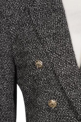 | Details | Langarm, V-Ausschnitt, Front Knopfleiste, Hahnentritt |