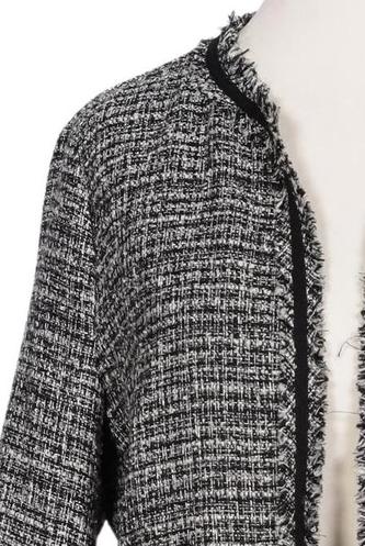 | Details | Fransen, Grobstrick, Langarm, Rundhals, Front Knopfleiste, Hahnentritt |