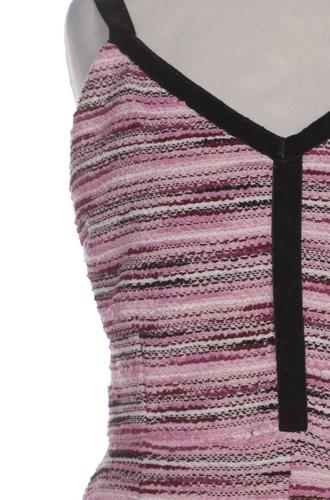 | Details | Grobstrick, ärmellos, V-Ausschnitt, Reißverschluss/Knöpfe hinten, Streifen |