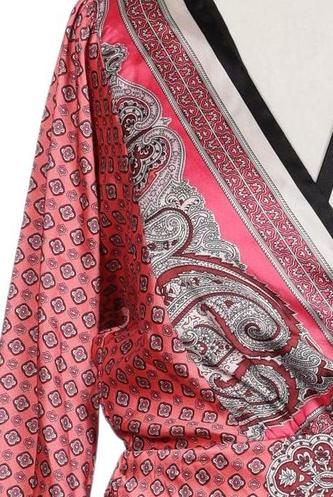 | Details | Satin, Langarm, Bindegürtel, Wickeloptik, V-Ausschnitt, Paisley |