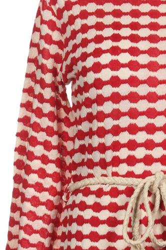 | Details | Grobstrick, Langarm, Bindegürtel, Rundhals, Rauten |