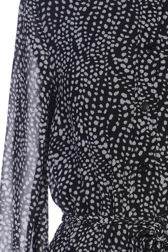 | Details | Chiffon, Langarm, Bindegürtel, Rundhals, Front Knopfleiste, Punkte |