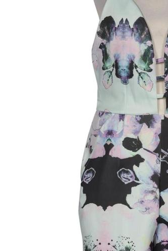 | Details | Satin, ärmellos, V-Ausschnitt, Reißverschluss/Knöpfe hinten, Floral |