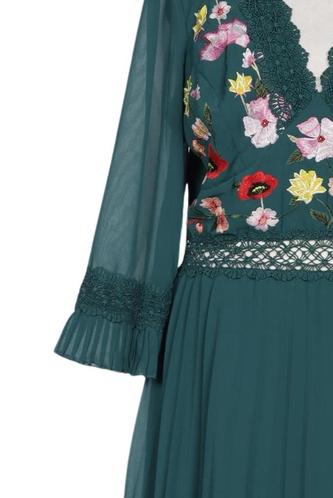 | Details | Stickerei, Spitze, Chiffon, Plissee, Dreiviertelarm, V-Ausschnitt, Reißverschluss/Knöpfe hinten, Floral |