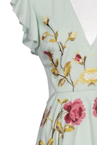 | Details | Stickerei, Cutouts, Kurzarm, V-Ausschnitt, Reißverschluss/Knöpfe hinten, Floral |