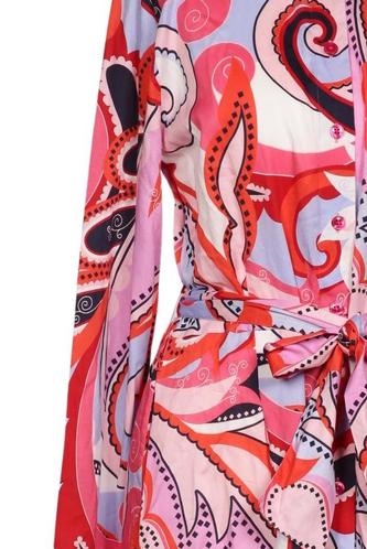 | Details | Satin, Langarm, Bindegürtel, Rundhals, Front Knopfleiste, Motivprint |