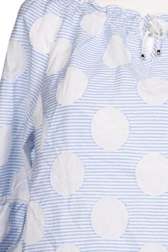 | Details | Jersey, Rüschen, Dreiviertelarm, V-Ausschnitt, verschlusslos, Punkte, Streifen |
