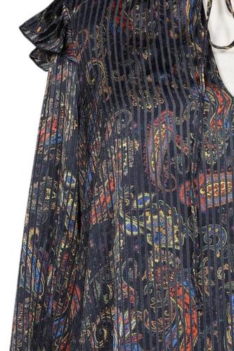 | Details | Satin, Rüschen, Langarm, V-Ausschnitt, Paisley |