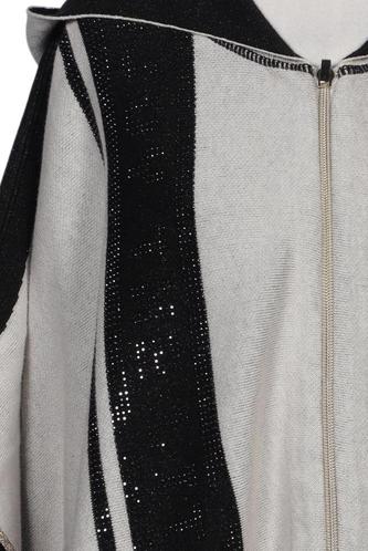 | Details | Grobstrick, ärmellos, Rundhals, Kapuze, Front Reißverschluss, Streifen |