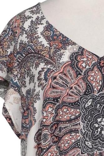 | Details | Jersey, Kurzarm, V-Ausschnitt, verschlusslos, Paisley |