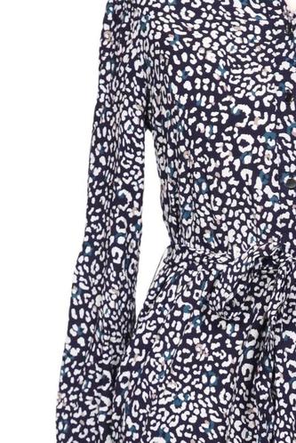 | Details | Langarm, Bindegürtel, V-Ausschnitt, Front Knopfleiste, Motivprint |